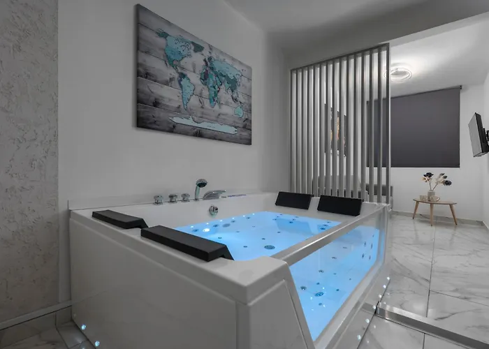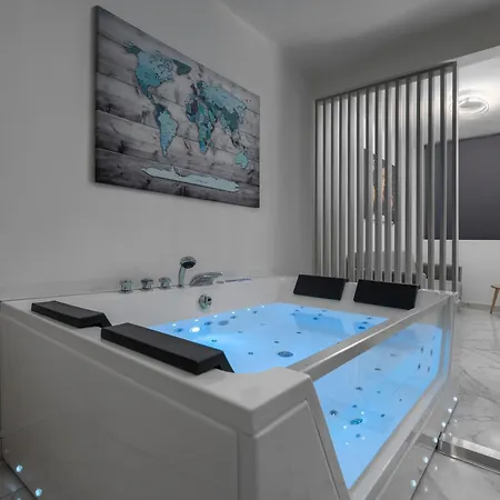 O Premium Jacuzzi Suite At The City Center, By Aqua Platinum disponibiliza comodidades auto-suficientes, tais como cozinha equipada e zona de refeições e uma área de refeições ao ar livre para conveniência dos hóspedes. O aeroporto em Salonica fica a 19 minutos de carro e a paragem Lefkos Pyrgos está a cerca de 5 minutes a pé deste apartamento. O alojamento dispõe de acesso ao salão termal que melhora a sua experiência de relaxamento.